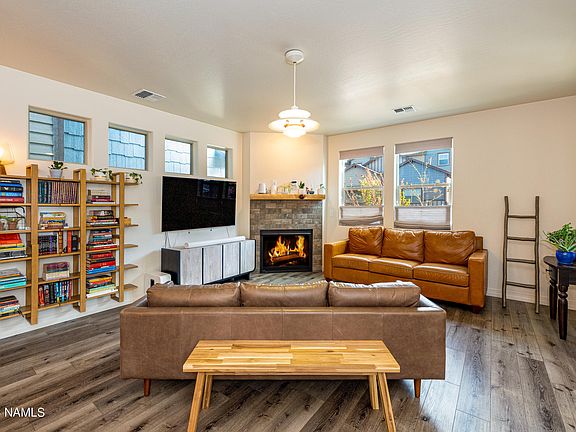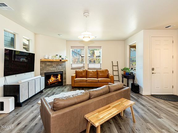 Welcome to this immaculate, 2100 sf, 3 bedroom, 3 bath gem with in Presidio in the Pines. Bright, modern, open, with beautiful beam accents, solar, central air and move in ready. With over 2000 sf, there is room for family and friends. Enjoy the open lower level with an upgraded kitchen, dining area and light-filled living room with a cozy fireplace. There is work or media area on the upper level. The detached garage has high ceilings, a sauna and a mini split for comfort - do you want a gym in your garage, or a workshop? Perfect! The enclosed yard is perfect for kids and pets. Only one block away from the park! Inspection has been completed and this home is truly like new. Short Term Rentals OK. This is a beautiful primary or second home, close to nature and Flagstaff amenities.