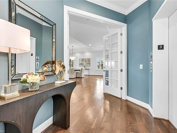 Go into elevated Florida living with this stunning third-floor penthouse-style residence in Terzetto at The Colony, Pelican Landing. Welcoming you from a private elevator lobby, this home is designed for comfort and elegance. The open-concept living, dining and kitchen area, anchored by a stylish wet bar, features beautiful wood floors, updated quartz countertops and a flowing layout ideal for entertaining. The split floor plan offers privacy for all three bedrooms and the den, which opens to its private lanai, ideal for enjoying spectacular sunset views. A full-length lanai spans the width of the home, capturing tranquil pond vistas and breathtaking sunrises. Modern conveniences abound, including electric hurricane shutters and a private two-car garage. Residents of The Colony enjoy an unparalleled lifestyle with access to the private beach pavilion, sailing, tennis, pickleball, bocce, attended fitness, kayak parks and exclusive dining at the Bay Club. This exceptional home combines privacy, luxury and a vibrant community, offering the quintessential Southwest Florida experience.