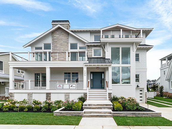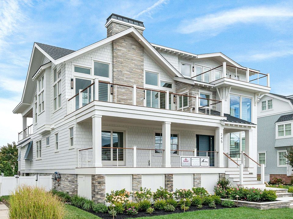 BlueVista Properties proudly presents 245 57th Street- Avalon's newest coastal masterpiece. Designed by OSK Design Partners, constructed by Coastal Modern Construction, and tastefully furnished by Interiors by Joann, this custom estate is ideally located just steps from 57th Street Beach Path and Avalon's magnificent Bay Park Marina. Situated on a rare oversized 80' by 110' lot, this 5,700 sq. ft. residence offers 7 en suite bedrooms, 7 full baths, 3 powder rooms, multiple indoor and outdoor living spaces, 4-stop elevator, attached garage accommodating up to 8- passenger golf cart, 1-car detached garage, and a resort-style pool, spanning three impeccably designed floors. Upon entry, a dramatic floating staircase enclosed in glass and framed by floor-to-ceiling windows sets a striking tone. The first floor features a separate wing with three private bedroom suites, including a front guest suite with private porch access and a custom-designed 4-bed bunk room, including 2 queen beds. A spacious multifunction laundry/mudroom/cubbie room offers dual full-size washer and dryers, custom built cabinetry, and a pool-access powder room. At the rear of the house, a sunlit family room with expansive windows and a 14-foot wet bar becomes the hub of casual entertaining. Adjacent is a versatile flex space—ideal for a gym, office, or game room— and a large, covered porch featuring IPE decking and gas fireplace, and is TV-ready for all-season enjoyment. The second floor showcases soaring vaulted ceilings and an open-concept living area with a fireplace and dual Anderson sliders that open to a sun-filled front porch. The chef's kitchen features custom cabinetry, a stunning white oak island topped with Taj Mahal quartzite, dual Wolf wall ovens, a 48” Wolf cooktop, Sub-Zero appliances, and a light filled walk-in pantry with prep sink and second dishwasher. A stunning, fully conditioned 300-bottle glass wine cellar sits beneath the beautiful glass and white oak staircase. The adjacent dining area includes a built-in serving buffet with undercounter fridge and opens to a spacious rear deck—offering both covered and open-air spaces perfect for entertaining. Two additional ensuite bedrooms off a private wing complete this level. Upstairs, the unique third-floor glass enclosed catwalk overlooks the impressive main living space and leads to a private primary suite retreat. The suite includes dual walk-in closets, a spa-styled bath with dual vanities and walk-in shower, and a private sitting room with a coffee wet bar and beverage center. Step out to the private deck to take in beautiful sunrise and sunset views over both the ocean and bay. An additional flex room with its own ensuite bath and private deck offers flexibility as a 7th bedroom, office, or den. Outdoors, the property transforms into a private resort. A 28’ by 15’ custom gunite pool with an oversized spa and sun shelf is a centerpiece, surrounded by lush landscaping and a premium sound system. The poolside cabana features a wet bar, bar seating and a comfortable lounge area. An outdoor shower completes this exceptional outdoor space. With six IPE-clad porches and decks, the home offers the perfect mix of sun, shade, and shelter for every occasion. Every inch of this home reflects careful craftsmanship and timeless coastal style—from Arctic White Hardie shingle siding, wide-panel nickel gap accent paneling, vertical accent paneling, and beautiful split-face ledgestone with metal roof accents to the detailed interior finishes, including wide nickel gap paneling, statement lighting, designer wallpaper and tile work, and natural stone countertops throughout. This is more than just a home— it's a legacy property and a true multi-generation family compound. Located in Avalon's sought-after South End, just steps from the beach, bay, and the beautifully renovated Bay Park Marina, 245 57th Street is a rare opportunity to own one of the most exceptional residences on 7 Mile Island.