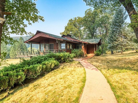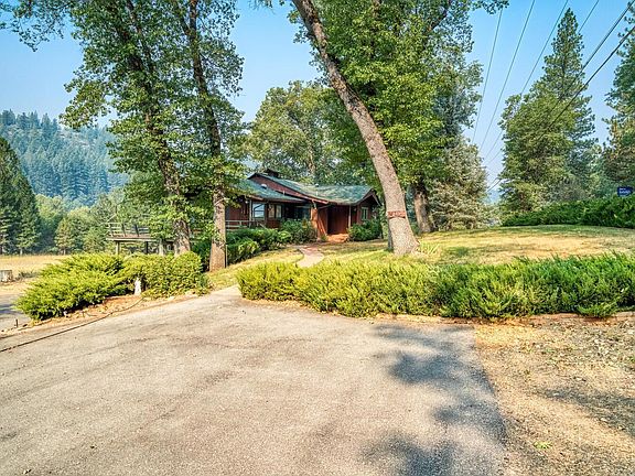 This solidly built and well maintained home has 2 beautiful acres which offers panoramic views of Thompson Valley and frontage on Greenhorn Creek. The kitchen has been nicely remodeled with new cabinetry, appliances and solid surface counters approximately 4 years ago at which time a newer composition roof was also installed. Upstairs there a sunken living room with vaulted ceilings, a master bed / bath suite, a second bedroom and bathroom, the kitchen, dining nook, utility room, forced air propane heat, an additional propane stove with brick hearth, tile flooring, and solar tubes for added light. Downstairs there is a finished guest quarters with full bath and an oversized one car garage and shop area. Outside there is a 2 car carport, asphalt drive way, extensive decking, covered porches, patio, and an artesian well. The views can be enjoyed from the living room, master bedroom, and the downstairs guest quarters. All of this along with numerous tall oaks for shade and a nicely manicured yard make for a setting which is hard to find.