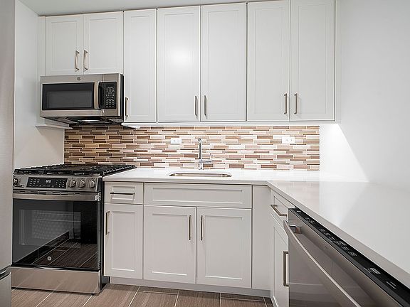Brand new bathroomNew stainless steel appliancesEmpire state building viewsPorcelain tilesSleek italian back-splash tilesChocolate brown tile floorsBright white modern kitchen