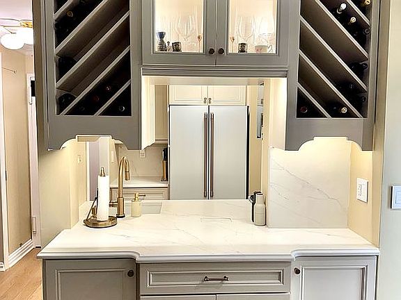 The kitchen is a masterpiece, featuring exquisite Compac Calacatta Glace countertops that complement premium Café Bluetooth-enabled appliances, making cooking a breeze. Enjoy seamless meal prep with a Delta pot filler, touch faucet, recessed countertop outlet, and a custom coffee station that’s perfect for kick-starting your mornings.