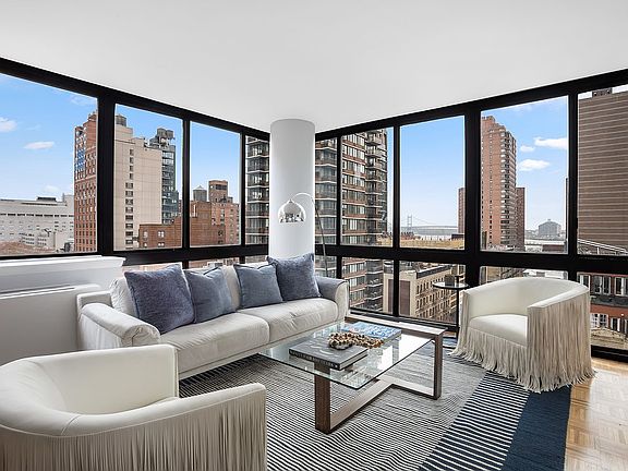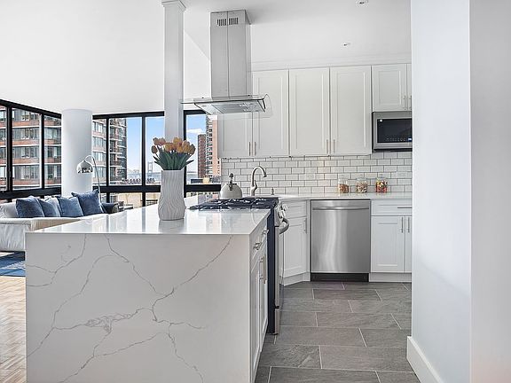 A gracious entry foyer introduces you to this thoughtful lay out boasting floor to ceiling windows with bright North & East exposures and partial river & bridge views. This converted 3 bedroom (2 bedroom plus library) with 2.5 baths offers a comfortable living/dining area perfect for entertaining. A brand new, open kitchen is outfitted with custom white cabinetry, quartz counter tops and stainless steel appliances. There are two spacious bedrooms, a den, two full baths plus a powder room. The primary suite features an ultra spacious closet along with an ensuite bath. The second bedroom, equally spacious, has an ensuite bath as well. The third room offers the flexibility as a den, guest room or home office. Additional features include private storage (included free of charge) and an in-unit Washer/Dryer. Pets welcome. Capital Assessment $856 per month.