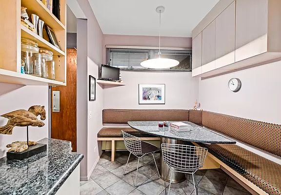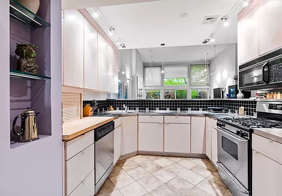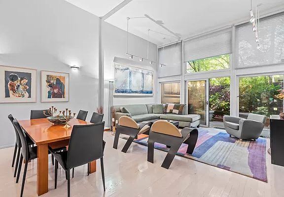 The parlor floor is thoughtfully designed with huge living/dining room is a dramatic space for entertaining, featuring soaring 13-foot ceilings, maple wood floors, and great lighting. Floor-to-ceiling windows send natural light streaming in all day, while glass doors lead out to the private patio, a tree-lined space that serves as a shady urban respite. The open custom designed kitchen is a chef's dream, equipped with stainless steel countertop with a butcher block section and beautiful oak cabinets. The built-in banquette with a granite table easily seats four-six people. There is a refined design aesthetic with a level of thought that melds precision and finish together effortlessly.