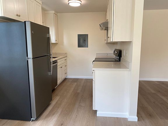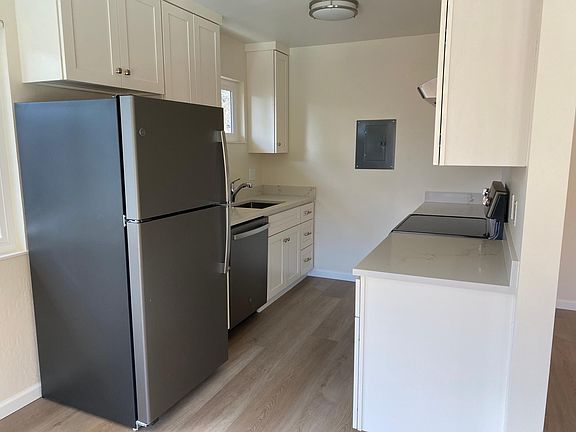 Recently Renovated Contemporary 2 Bedroom 1 Bath Apartment with Balcony and in unit Washer/Dryer. Maple soft close kitchen and vanity cabinets with Cesaerstone quartz countertops. Energy efficient slate colored finger printless stainless steel appliances-Maytag Dishwasher, GE Refrigerator, GE Radiant Heat stove/oven. New luxury plank flooring throughout. New double-paned windows and sliding beveled mirrored wardrobe closet doors. Spacious living room and dining area. Large storage area included with one covered parking space. Plenty of street parking. Water and garbage paid by owner. PGE paid by tenant. Sunny and bright. Clean, quiet and private. Excellently managed and maintained. 6 month or 12 month lease options. Great neighborhood for walking, biking or jogging. Conveniently located 1 mile from Cl Train, Downtown Mountain View and Microsoft. Easy access to highway 85, 101, 280 and Central Expressway. 1block away from Whisman Tennis Courts and Stevens Creek Trail. Owner pays for water, sewage and garbage. Tenant pays for gas, electricity, cable and internet.