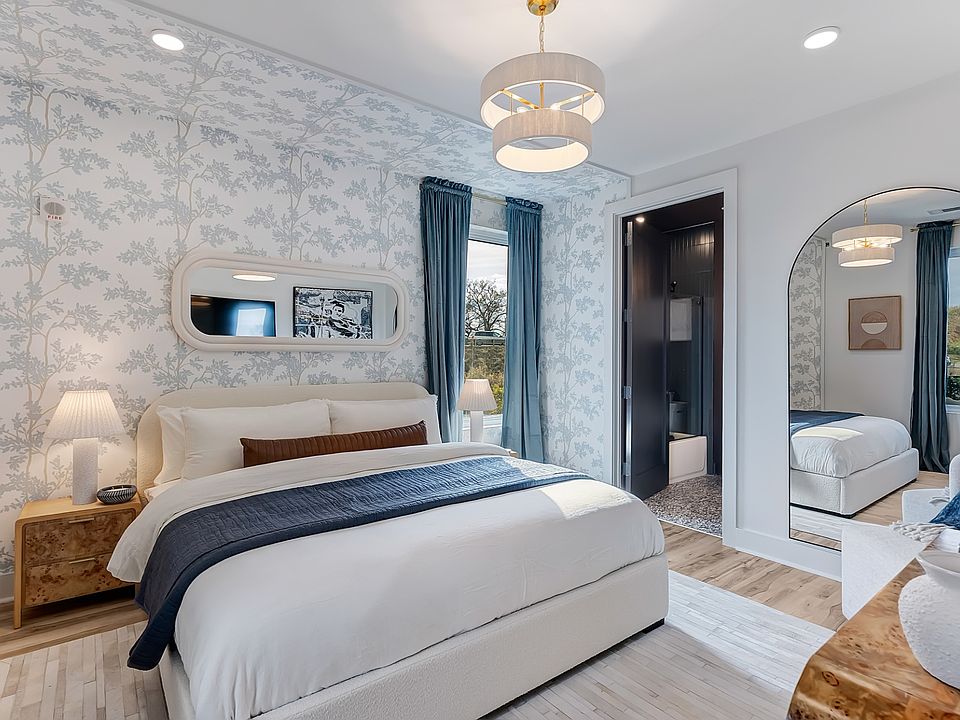Inside, you’ll find warm, elevated design throughout, including a full-grain genuine Italian leather sleeper sofa with a commercial-grade pull-out system used in boutique hotels. Luxury linens, quartz countertops, and curated furnishings create a true five-star experience. A dedicated podcast studio setup adds an elevated touch for digital nomads, creatives, and remote professionals. Thoughtful touches like a turntable and a Fender guitar help elevate the guest experience and maximize occupancy, with curated details that nod to Nashville.
