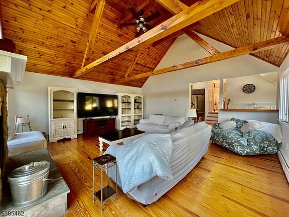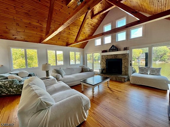 Scenic lakefront, private setting! Custom built features cathedral ceiling with exposed beams. Stone wood burning fireplace, hardwood flooring. Open stylish floor plan. Spacious deck, yard & dock. Double lot borders green acres. Tranquil waterfront setting in a no wake zone. Enjoy outdoor living on patio, side yard & lake. Well appointed interior details from custom wainscotting, hardwood flooring, exposed beams, solid wood doors & trim. Kitchen, granite counters, breakfast bar, gas cooking, stainless appliances. Sunny dining area open to great rm & deck. Two bedrooms, full bath with jetted tub, separate glass shower. Option to convert garage to bonus rm. Enjoy 4 seasons on Lake Hopatcong. Optional beach club. Boat, swim, hike, bike or RELAX, 1 hr NYC
