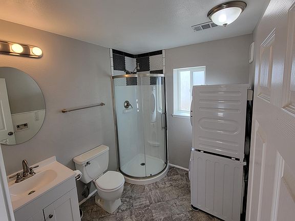 The lower level of the home contains a spacious living room area equipped with two more ceiling fans, an additional bedroom with a large closet, and a bathroom/laundry room. The downstairs bathroom features a beautiful glass corner shower with a sliding door.