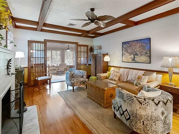 Experience the perfect blend of historic charm and modern convenience in this stunning 1923 Craftsman home. This 3-bedroom, 2-bathroom residence is nestled on a private, lushly landscaped lot. Step inside to discover preserved, unpainted original hardwood floors and trim, which have been meticulously cared for throughout the home. The living room features a cozy fireplace and flows into a formal dining room and a sun-filled family room with elegant French doors. The large, updated kitchen is a chef's dream, boasting a spacious prep island, beautiful butcher block countertops, stainless steel appliances, and abundant cabinet space. The primary bedroom is a peaceful retreat with an en suite bathroom and a sitting room that can easily be transformed into a walk-in closet. Two additional spacious bedrooms share a well-appointed bathroom and an indoor laundry room. Adding to the home's functionality are a large attic for storage and a screened-in porch perfect for relaxing. This property presents an incredible opportunity for multigenerational living or potential rental income, thanks to the converted garage. This separate living space offers a studio layout with a private full bath and kitchenette. The outdoor oasis is surrounded by majestic oak trees and includes a large green space and a deck for entertaining. This private and peaceful home is conveniently located. Schedule your tour today!