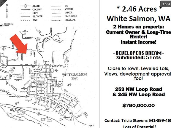 $790,000 OBO - DEVELOPERS DREAM!!! *5 LOTS Total (w/ views, development approved) *2 Existing Homes (w/ 1x existing rental income) *3 Buildable Lots (one hilltop w/ trees) It's no secret that White Salmon and Hood River, OR area is busting at the seams with people and with a shortage of homes to meet demand! This property is approved for residential or light commercial development into single family, town houses, or even storage units! This property is already generating revenue!! Live in the beautiful cottage home while developing the property or develop them all right away! The property features: -- 3x Buildable Lots ----- One hilltop acre w/ trees & views ----- Two, pre-leveled lots on side of hill (w/ views, above existing homes) -- 2x Existing Homes ----- One rental w/ existing long-term tenant $975/mo in revamped mobile home; new windows, new plumbing, and fresh paint. ----- One beautiful cottage house; 3 bedroom/1 bath, full finished basement, lightly fenced yard, sprinkler system, raised garden beds, water feature/fountain, trex-deck patio w/cobblestones, stamped concrete sidewalk border along many beautiful flowerbeds, large sized tool shed w/ carport, new windows, many upgrades, including brand new 30+ year roof.