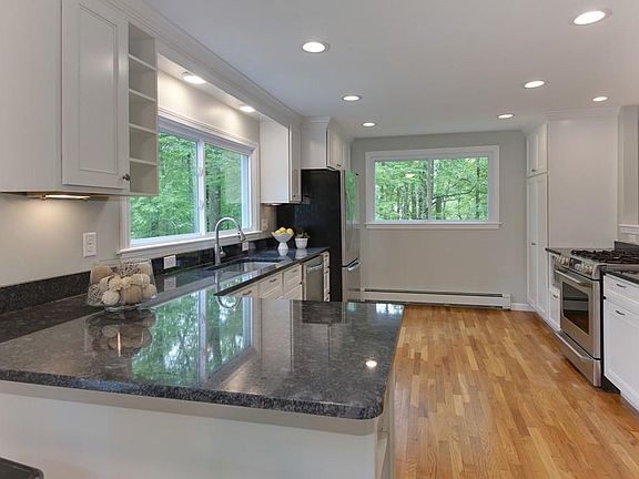Come take a peek at this lovely, turn key property in the amazing town of Holliston! Enter into a gorgeous, updated kitchen w/ granite counters, ss appliances, breakfast bar, amazing cabinet space. Open floor plan to dining room - easy for entertaining. Oversized living room with cozy wood insert, recessed lighting and garage access. First floor offers updated half bath and refinished hardwood floors throughout. Travel upstairs to oversized master - large walk in closet with closet system. Two sizable bedrooms, spacious linen closet, and refinished hardwood floors. Lavish full bath gutted to studs with tile floor, double stone vanity, oversized tile tub/shower. Head outside and enjoy the amazingly peaceful back yard, stone patio and private setting. Lots of updates: new windows/doors, new boiler, on demand water heater, garage doors, & new electrical. 2 car garage & room to expand in the basement. Don't miss out on this amazing home!
