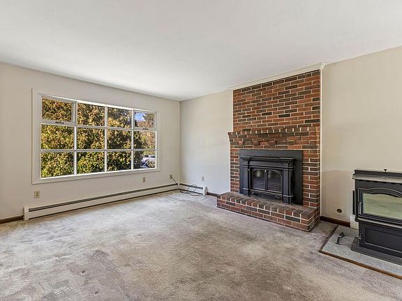 Inside, the living room features a cozy brick hearth with fireplace, a pellet stove, and carpeting with original hardwood floors hidden beneath just waiting to be uncovered and brought back to life. The full, unfinished lower level offers strong potential for additional living space, whether it's a family room, office, gym, or guest suite.