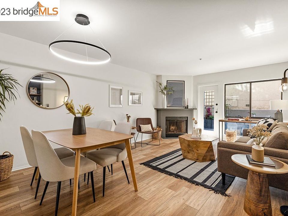Exceptional Adams Point one-bedroom condo that offers a blend of modern elegance and comfortable living. Step inside and be greeted by an open living space. The centerpiece of the living room is a wood-burning fireplace, perfect for cozy evenings and creating a warm ambiance. Overhead, a modern light fixture illuminates the dining space, adding a touch of contemporary flair. The kitchen is designed to make entertaining a breeze, with an open countertop that bridges the gap between the kitchen and the living space. This layout is great for entertaining and hosting gatherings. The kitchen itself has been thoughtfully updated w/SS appliances, stone countertops, tiled backsplash and rich wood cabinetry. Beneath your feet, the entire condo boasts new luxury vinyl plank flooring in a warm hue, adding a sense of comfort and sophistication throughout. The sizable bedroom is a retreat on its own w/two double-sized closets. The bathroom has also been given a contemporary makeover, showcasing a large vanity top and stylish tile shower/tub combo. An oversized patio for outdoor entertaining is a rare find! Garage parking and bonus storage space included. Blocks from shops, transport, restaurants, and Farmers Market!