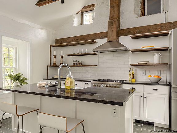 This is a sparkling top-to-bottom renovation of the 1757 Vandermark House having been done with great sensitivity, while inviting a flooding of light into the home, rare for a Dutch stone house. If anyone has seen this property previously, they will be amazed at the transformation. The gorgeous new kitchen, vaulted into the previous level above, features exposed beams, marble countertops, a farm sink, high-end appliances and a beautiful slate floor. Additionally, there is a renovated full bathroom with radiant heat on the second floor, a sweet half bath off the kitchen and another full bath in the basement. The original details are still present: deep-set windows, wide board floors, beams, Dutch door and hardware. Once owned by local author Gail Godwin, the Vandermark House boasts an easy flow inside and a perfect Stone Ridge location outside. A bluestone patio and screened porch with a summer-kitchen fireplace overlooks meadow and mountain views. At the moment there is nothing quite like this restored elegance. Enjoy living in old world charm with all the modern updates conveniently located minutes to Stone Ridge and High Falls. A 15 minute drive will take you to bustling historic uptown Kingston, New Paltz, Mohonk Preserve and a bit further to Minnewaska State Park. Enjoy nearby seasonal Apple, pumpkin and berry picking, local Breweries, Wood fired pizza, antique shopping, restaurants and more.