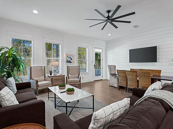 Discover an exceptional opportunity to own a beautifully designed coastal retreat in the highly desirable Seacrest area of Florida's Emerald Coast. Serenity at Treetop combines modern luxury, thoughtful design, and unbeatable location, making it a perfect primary residence, vacation home, or investment property.Step inside this spacious 5-bedroom, 4.5-bathroom home and experience the effortless flow of open-concept living. The heart of the home features a bright, fully equipped kitchen with stainless steel appliances, a generous island with breakfast bar seating, and abundant storage -- ideal for both everyday living and entertaining guests. The adjacent living and dining areas offer plenty of room for family gatherings and relaxed coastal living. Designed with both comfort and style in mind, the interior blends contemporary finishes with warm coastal charm. The primary suite provides a serene retreat with a luxurious ensuite, while additional bedrooms offer flexible sleeping arrangements and privacy for family or guests. A upstairs recreation room adds extra space for fun and relaxation with a shuffleboard table and media setup.