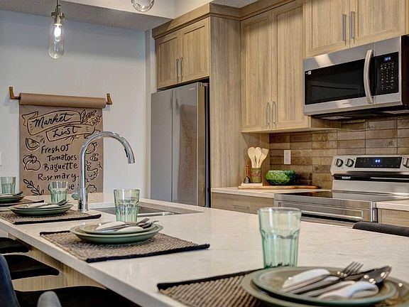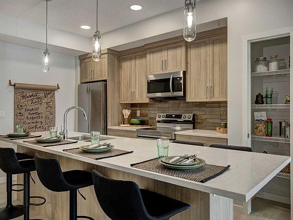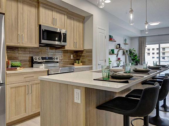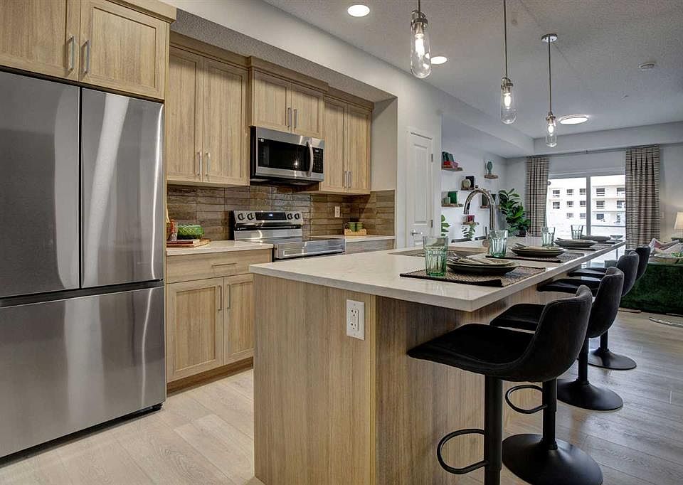 INTRODUCING GLACIER RIDGE, IN BEAUTIFUL NORTHWEST CALGARY. BUILT BY CEDARGLEN LIVING, WINNER OF THE CustomerInsight BUILDER OF CHOICE AWARD, 5 YEARS RUNNING! BRAND NEW "GR04" unit with high-spec features. You will feel right at home in this well thought-out TOP FLOOR, 651.0 RMS sq.ft. 1 bed, 1 bath home with open plan, 9' ceilings, LVP flooring throughout (NO CARPET), Low E triple glazed windows, BBQ gas line on the patio, Fresh Air System (ERV), and so much more. The kitchen is spectacular with full height, two tone cabinets, quartz counters, upgraded bank of drawers for pots and pans, undermount sink, rough-in water line to the fridge and S/S appliances. The island is extensive with built in flush breakfast bar, which transitions into the spacious living area, perfect for entertaining. The spacious primary bedroom has a large bright window (triple pane windows) and sizeable walk-in closet. Right beside your bedroom is a 4pc bath with quartz counters, upgraded tiles to the ceiling, and undermount sink. Nearby is the spacious laundry/storage room, this is a must see (washer & dryer included). Highlights include: Hardie board siding, designer lighting package, sound reducing membrane to reduce sound transmission between floors, clear glass railing to balconies and 1 titled underground parking stall included. A once in a lifetime community in Northwest Calgary. Framed by views of the Rocky Mountains and distinguished by natural coulees that cross the land, Glacier Ridge offers a rare chance for families to live in a new community. PET FRIENDLY COMPLEX, PRE-CONSTRUCTION OPPORTUNITY (drywall stage) and PHOTOS ARE OF A DIFFERENT SHOW SUITE FOR REFERENCE ONLY, FINISHING'S/PLAN WILL DIFFER. ESTIMATED COMPLETION IS DECEMBER 4, 2025. VISIT THE SHOW SUITE TODAY FOR MORE INFO!