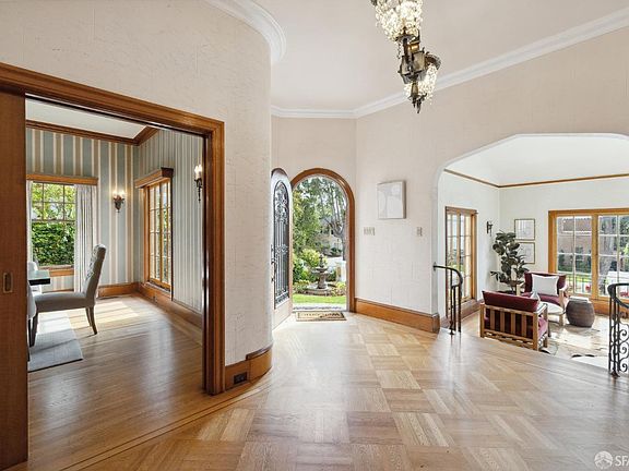 Imposing Mediterranean Revival single-family residence in prestigious St. Francis Wood. An elegant entry foyer welcomes visitors to the main floor and its large living room with fabulous fireplace. A large formal dining room offers walk-out access to a stone patio and the manicured rear yard. An updated kitchen with an island and plentiful cabinetry adjoins both the dining room and the spacious family room. French doors connect the family room to the serene rear yard, with mature plantings and, complete with sunken hot tub, the perfect, secluded retreat! A full bath, guest room and laundry room round out the main floor. 3 spacious bedrooms and 3 full baths on the upper bedroom level include a beautiful primary suite with two walk-in closets, dual vanity, walk-in shower and jetted tub. A guest suite, 3rd bedroom and bath plus library/office are also found here. Beautiful outlooks from the primary suite and office area include partial ocean views! The thoughtful floor plan includes a 3-car garage connecting internally to the home and this large garage level offers additional storage and expansion potential. 245 Santa Clara is a unique opportunity to live in a retreat-like setting with convenient access to Downtown. West Portal Ave with cafes, bars and restaurants is a short walk.