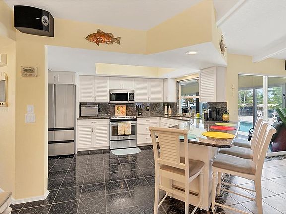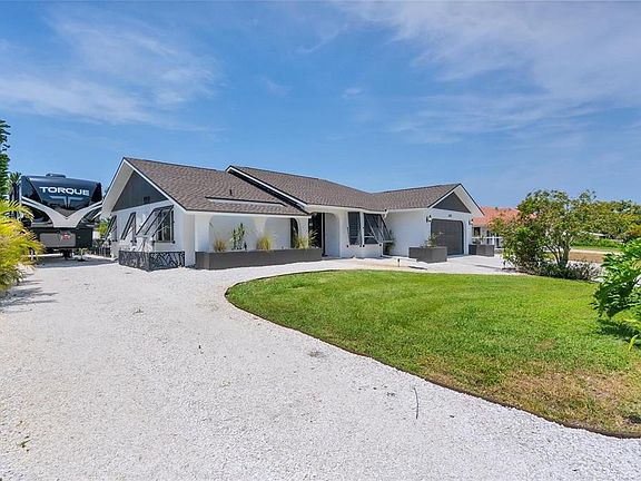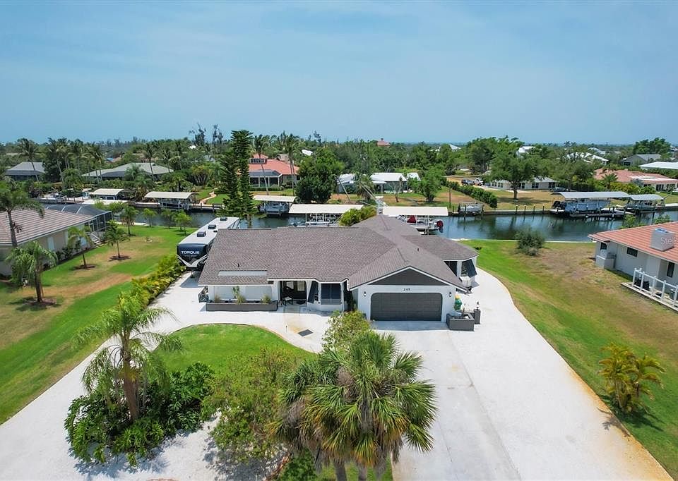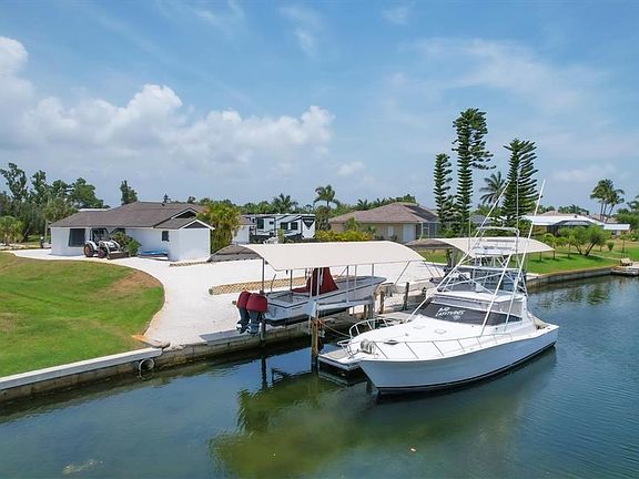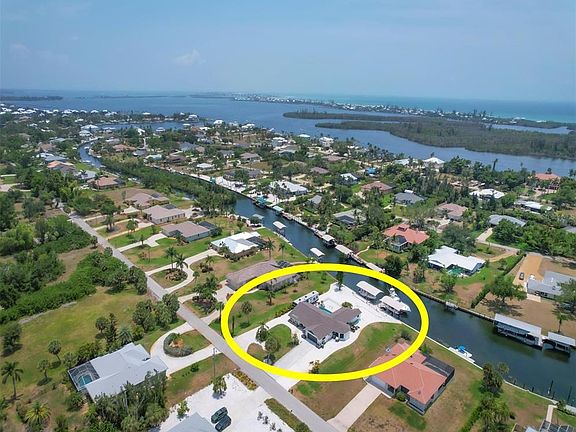 Sunsets!! Sunsets!! and more Sunsets!! While sitting in your backyard oasis enjoying the panoramic water views you will experience a different Florida sunset everyday of the year. This waterfront home offers an oversized lot (.51 acres) on a saltwater canal leading to the Intracoastal and Gulf of Mexico. If you value a great location for your activities by land or sea this home has it. Located only minutes from Boca Grande and Manasota Key beaches by car or by boat, you'll likely choose your boat. As you approach the front door you'll admire the Bahama shutters giving the home a coastal vibe. Upon entering the home, the first thing you'll notice is the spacious living area and large expansive wall of glass sliders leading to views of the pool and waterfront. You then enter the spacious kitchen which has been recently updated with plenty of counter space and cabinet storage. The kitchen opens to a spacious Family room that will probably be where you spend most of your time. As you exit the main living space to your expansive enclosed lanai your heart should really start to beat faster. This area features a large deck surrounding your pool and spa. The dock area and waterfront features are probably the most important. It allows you the ability to have your water based toys all in one spot. The area features two covered boat lifts, one being a 12,000lbs lift and the other a 16,000lbs lift, at the same time leaving room for an even bigger vessel. The home also incorporates a storage area off the back of the home for all your pool and boating items. This setup is very difficult to find and won't leave you disappointed. If you are into adventure this house needs to make your short list. Back inside the master suite is large and spacious with direct access to the lanai and pool area. It features a recently updated shower as well as plenty of storage space. The guest rooms are on the other side of the home and offer you and your guests much needed privacy. They share a recently updated bathroom and have access out to the pool area from their side of the home as well. This property has a newer roof (2023), Hurricane shutters (2020), A/C (2020), and boatlifts and canopies (2017). It also has shell landscaping over much of the property for ease of maintenance.