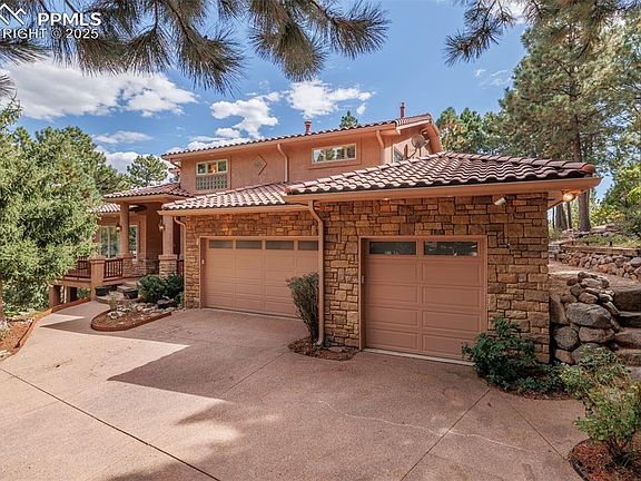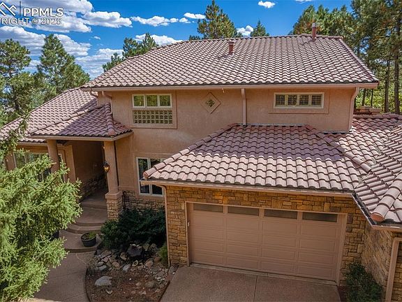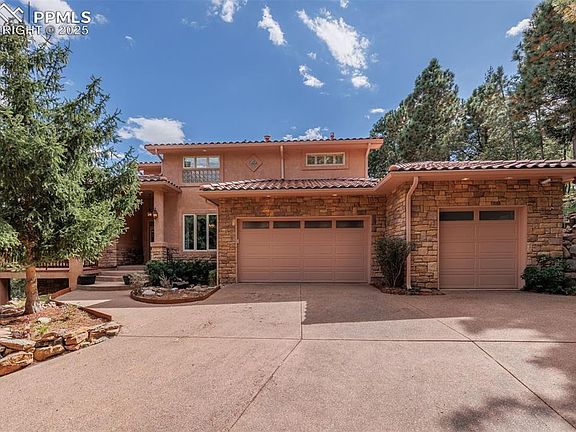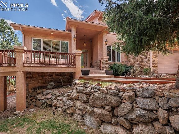 A MILLION DOLLAR SETTING is yours with this prestigious custom home in the exclusive neighborhood of The Spires on Cheyenne Mountain, in award winning Cheyenne Mountain School District 12. Situated on .7 acres with extensive OUTDOOR LIVING AREAS including fireplace, in ground hot tub, outdoor kitchen, paths throughout the property, and backing to open space, this home is designed for fabulous PRIVACY and year round enjoyment. Inside you enter to an impressive 2 story vaulted Great Room open to the Kitchen and with great views of the back yard and walk out to the large back deck. A 2 story stone fireplace, built ins and a sweeping curved staircase are also WOW features of this space. The main floor also features a Bedroom, Bath, Sun Room encased in windows, and Formal Dining Room with built ins. You can't miss the enormous Eating Area off the Gourmet Kitchen with a second fireplace, wet bar area with beverage frig, Thermador, Jenn Air and Kitchenaid stainless appliances, cherry cabinets, granite counters and large pantry. Beautiful cherry floors cover much of the first floor. The second floor features a Master Get-A-Way with a third fireplace, Office with built in desk, Master Bedroom with a wet bar and small frig and a 5 piece Master Bath and walk in closet. The basement has a spacious Family Room that walks out to the back yard and offers a wet bar with mini frig, the 4th fireplace and built ins. 2 Bedrooms are downstairs that share a bath. Also the bonus of an impressive wine room. There are extensive decks surrounding this house with walk outs to the decks from most of the main and upper floors. A huge 3++ car garage with loads of built ins, a heated workshop area and even a sink for clean ups. Two laundry spaces - one upstairs and one in the basement. Loads of windows to bring the spectacular outdoors in... So much to offer and an AMAZING VALUE!!!