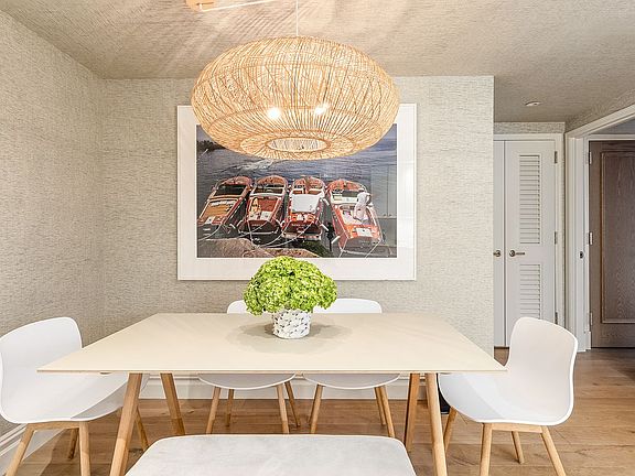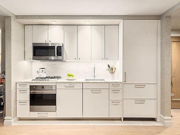 Enter this quiet, 845 sq ft home to the open kitchen/dining room. The kitchen features Poggenpohl cabinetry, Vermont Danby countertops, and high-end appliances including a paneled Liebherr refrigerator, paneled Bosch dishwasher, and a Smeg cooktop and oven. The open concept accommodates a dining table for six or could easily function as a home office. The kitchen leads to the large living room with an adjacent garden-facing terrace. Discreetly off the kitchen is the king-sized garden-facing primary with two oversized closets. Across the hall is the outfitted laundry room and bathroom featuring a radiant-heated mosaic marble floor, a new glass door shower with marble tiling, Lefroy Brooks polished nickel fixtures and a Robern medicine cabinet.