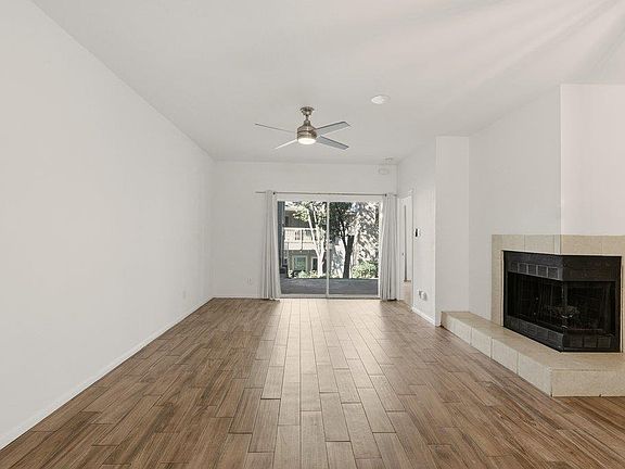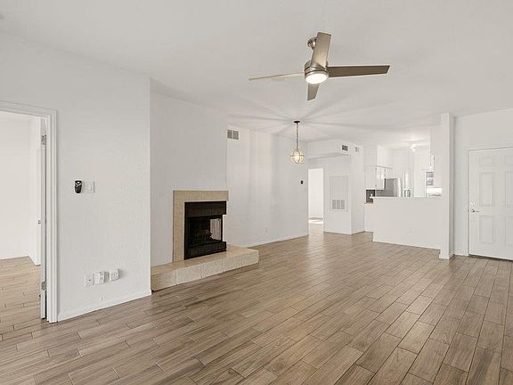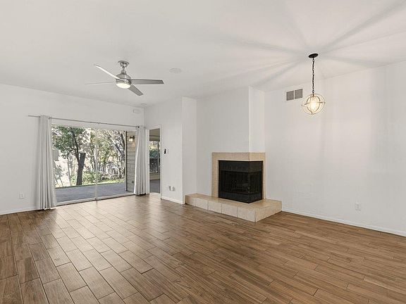 This first-floor condo offers comfort, convenience, and inviting modern style. The open layout is filled with natural light thanks to a sliding glass door leading to the private covered patio, perfect for morning coffee or unwinding at the end of the day. The living room features a cozy fireplace, while the adjacent kitchen includes bar seating, butcher block countertops, stainless steel appliances, and contemporary fixtures throughout. Both bedrooms are spacious, and the primary suite stands out with its own sliding doors to the patio and an ensuite bath with a double vanity and walk-in shower. Laminate flooring runs throughout the main living areas for easy maintenance and a refreshed look. Located in a gated community with two pool areas, a BBQ area, outdoor lounge spaces, and plenty of gathering spots, this home offers a relaxed lifestyle with excellent amenities just minutes from Downtown, the East Side, and Town Lake. Assigned resident parking plus guest spaces make coming and going simple. Refrigerator, washer, and dryer are included, along with lawn maintenance and water/trash service.