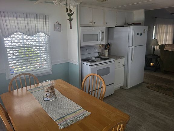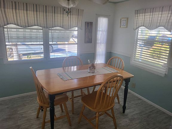 2-bedroom 1-bathroom home is move in ready. Updated kitchen with white cabinets, new countertops, and laminate flooring. Appliances stay including the washer and dryer. Back patio with Pergola and patio furniture. Bonus enclosed Florida Room on the side for added living space. Large, attached storage room has golf cart door. Shed in yard. Pet friendly community. No rear neighbors! Call today to view.