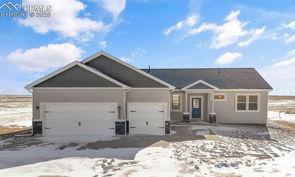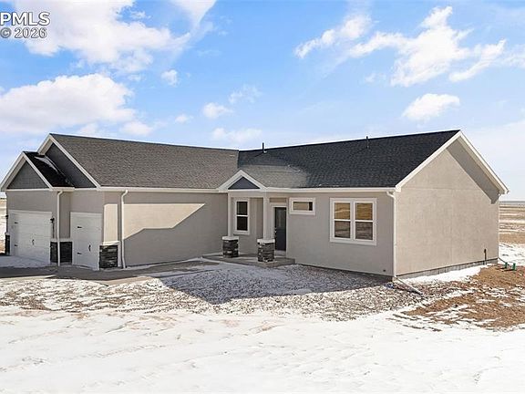 Experience modern Calhan living in this spacious 3-bedroom, 2-bath ranch-style home sitting on 35 acres of land. With 1,904 sqft of thoughtfully designed living space, this fully electric home blends energy efficiency with elegant finishes. Enjoy 9-foot ceilings and an open-concept kitchen and dining combo that’s perfect for entertaining or family gatherings. The kitchen features granite countertops, a large island, GE appliances, and a sleek design that flows seamlessly into the dining area. Luxury vinyl flooring and soft carpet throughout the home create a comfortable and stylish atmosphere. The master suite offers a luxurious 5-piece bath complete with a soaking tub and walk-in shower for the perfect retreat. With a 3-car garage, durable stucco exterior, and peaceful Calhan surroundings, this home offers the ideal mix of space, comfort, and style — built to deliver lasting quality and everyday convenience.