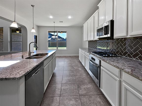 Cozy fireplaceCovered patioAccent backsplashFenced-in backyardNeutral color paint schemeKitchen islandDouble sinks