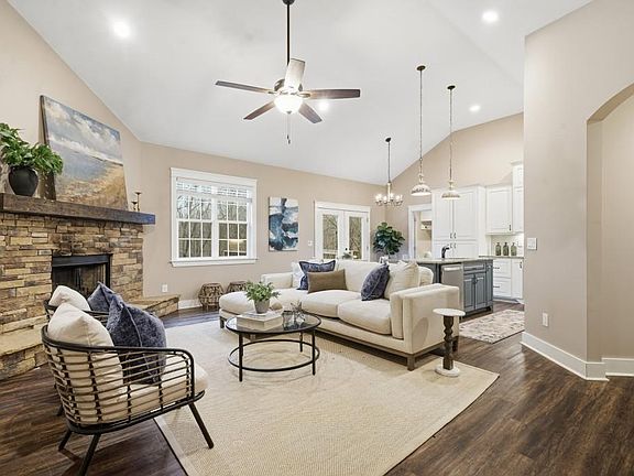 This is just what you’ve been looking for — and more! This gorgeous ranch home on 2.25 acres offers the perfect blend of comfort, function, and style. The thoughtfully designed floor plan features four bedrooms and three full baths, with inviting spaces that make this home as cozy as it is practical. The open-concept main level showcases upgraded LVP flooring, a beautiful eat-in kitchen, and a welcoming living room centered around a handsome stone fireplace. The spacious primary suite includes a double vanity and large tile shower, creating a peaceful retreat. The finished terrace level is truly a second living space — bright, spacious, and beautifully designed for everyday enjoyment. It features a family and office area, workout space, guest bedroom, full bath, and tons of storage. Pre-wired for a home theater, it’s the perfect place to relax, entertain, or work from home. Step outside to your private backyard oasis featuring lush landscaping, a gazebo, and a heated saltwater pool — ideal for entertaining or unwinding in total serenity. The additional carport provides convenient parking and ample space for your RV, boat, or extra vehicles. Conveniently located just minutes from Highway 515, this home does not disappoint in comfort, function, or beauty. Photo of living room is virtually staged.