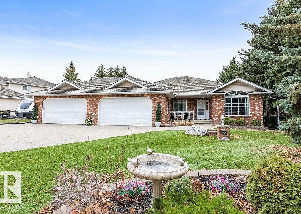 The acreage property you’ve been dreaming of just hit the market! This exceptional custom estate bungalow includes a F/F basement on a private, fully fenced lot with all-turf front and back yards and RV parking. Main floor features vaulted ceilings, a large dining room with double-sided gas fireplace to the living room, and 2-tone custom kitchen with crown moulding, granite, and Elmira appliances. Primary suite with 4-piece ensuite and W/I closet, plus 2nd bed/den, 3-piece bath, laundry, and mud room. Basement with new flooring (2022) includes huge rec room with wet bar, two large bedrooms, den, and 4-piece bath and storage. Highlights: hybrid septic system(grey water to city, black to holding tank), new vinyl plank (2025), fresh paint (2021), upgraded 220 power (2022), 75L HWT (2023), industrial AC, in-floor heated 4-season room, powered gazebo, and O/S 4-car heated, soundproofed garage with epoxy flooring, hot/cold taps and 3-piece bath. Perfect for family living and entertaining.