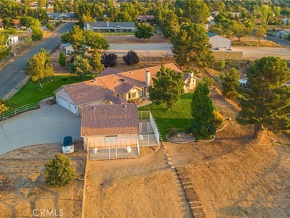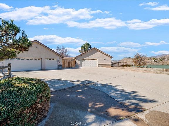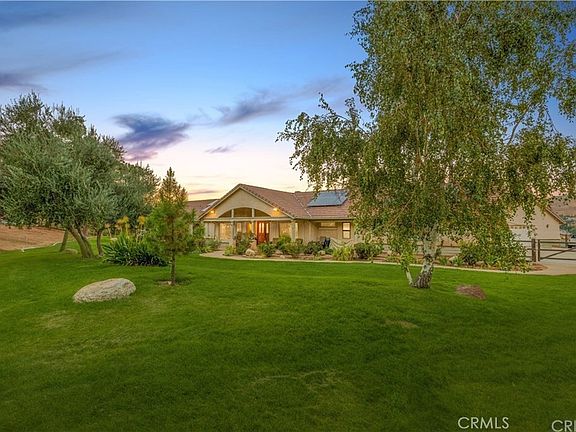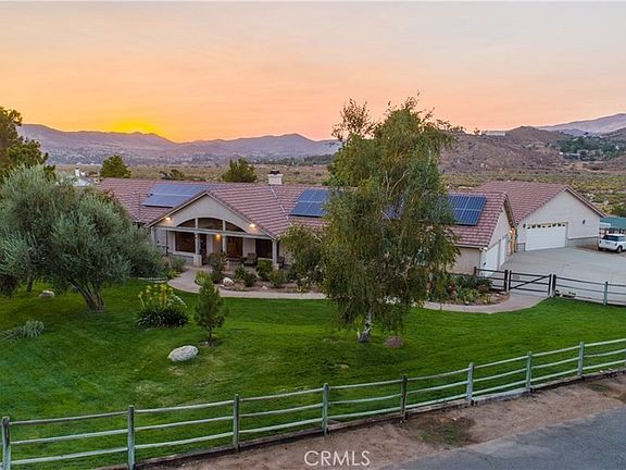 Picture yourself in this sprawling, immaculate property on over 2.5 acres with gorgeous panoramic views of the mountains. One of the nicest equestrian estates in the Santa Clara Estates. This home, equipped with fully PAID OFF solar, county water connected, county gas connected. Property offers 4 large bedrooms, 3 bathrooms over 2778 sq ft of living space. The large great room with surround sound will be a hit when entertaining. Updated kitchen with stainless steel appliances. Oversized master bedroom, bathroom you will find the jacuzzi tub is exactly what you need to relax after a long day and enjoy falling asleep to the ambiance of the fireplace in the master suite. The backyard offers stunning unobstructed views of the beautiful mountains. Custom 4 stall shed row barn features a nice size tack room and each stall has French drains along with full stall mats, outside runs, and infrared heaters and misters which will help with temperature control for your horses. 6 large wrought iron dog kennels for the hobbyist dog trainer or breeder. Other outside features include security lights, a graded arena, wash rack, and a gate that leads directly to the riverbed with miles of riding trails. Enjoy the park-like setting of the beautifully landscaped front and back yards accented by solar lights and mature fruit trees. There are TWO garages, an oversized three-car attached garage and a separate detached oversized three-car garage that can be used to store equipment or cars or as a workshop or ADU. Truly a must see home!