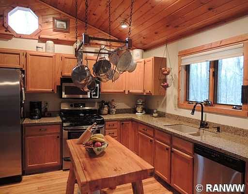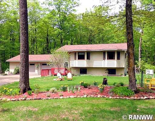 Well-designed home on 1.42 acres. Open living/dining/kitchen, vaulted pine ceilings & maple floors in kitchen & master BA. Lower level has family rm, 2 BRs, full BA, kitchenette & laundry. Updates include new quartz kitchen counters, new roof, septic, well, on demand water heater, appliances & generator. Heated 2-car garage has air filtration system - workshop area & storage. Deck overlooks backyard - woodland views. Less than a mile from Lake Namekagon boat landings on Hwy D & Garden Lake Rd!