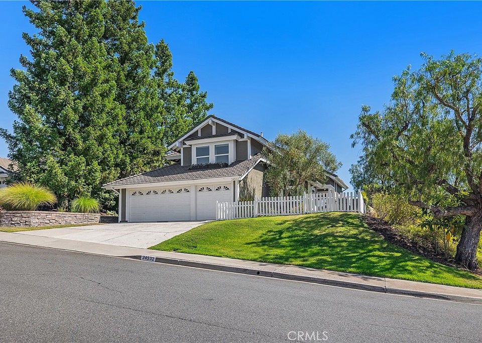 Nestled on a desirable corner lot, 24532 La Cienega Street offers warmth, charm, and an ideal layout in the sought-after Ridgefield community. Framed by a white picket fence and mature landscaping, this inviting home features soaring ceilings, abundant natural light, and a thoughtfully designed floor plan with formal living and dining areas, a separate family room, and a versatile main-level bonus room with an adjacent 3/4 bath—perfect for guests or a potential fifth bedroom. The kitchen boasts quartz countertops, subway tile backsplash, stainless steel appliances, and a sunny breakfast nook. Upstairs, spacious bedrooms and beautifully appointed bathrooms provide comfort and style. Outside, enjoy a private backyard with lush plantings, brick-lined patio areas, and hillside views. Additional highlights include a three-car garage, central AC, and access to nearby parks, trails, all with low HOA and no Mello Roos. Ideally located near Laguna Hills High School and the Community Center, this home offers a peaceful lifestyle with convenience close at hand.
