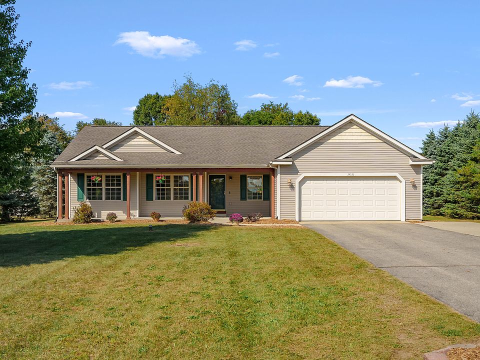 Welcome to 24532 Vargas in the desirable Brownstone neighborhood and Mattawan Schools! This spacious 4-bedroom, 2-bath ranch offers 2,353 sq ft of finished living space on a beautiful just over half-acre lot. Step inside to an open-concept main floor with vaulted ceilings that flow through the entry, living room, dining area, kitchen, and primary suite. You will enjoy the kitchen with center island and stainless appliances. The primary bedroom features an ensuite bath and walk-in closet, while two additional bedrooms, a full bath, and main-floor laundry round out the main floor. The finished basement includes a 4th bedroom and generous living space — perfect for entertaining, hobbies, or a home office. Outside, enjoy a covered front porch, expansive concrete back patio, fire pit area, and storage shed.