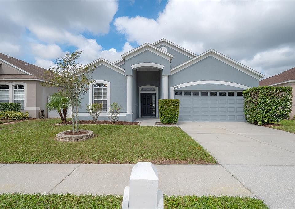 Outstanding renovated 3-bedroom, 2-bathroom house with a 2-car garage, screened saltwater pool, and spa, all set within a private vinyl-fenced backyard in a very low-fee HOA community. Perfectly located less than half a mile from highly rated Denham Oaks Elementary and close to grocery stores, shopping centers, the Premium Outlets, and restaurants, this home offers both comfort and convenience. The inviting outdoor living area features a spacious covered lanai, screened saltwater pool and spa and privacy from the vinyl fence. A child safety fence is conveniently installed for ease of use and peace of mind. The pool views from the primary suite, living room, and kitchen fill the home with natural light, and this, combined with the open floor plan and generous common areas all contribute to creating a bright and spacious living space. Thoughtfully remodeled throughout, the kitchen with breakfast bar, nook and coffee station boasts stainless steel appliances (including a gas stove and French door refrigerator with water dispenser), granite countertops, updated cabinetry with crown molding, newer hardware, recessed lighting, and modern plumbing fixtures. Both bathrooms feature granite counters, upgraded cabinetry, and refreshed lighting. The primary suite includes a walk-in closet, dual sinks, jetted tub, and separate shower. Additional updates include new tile flooring in common areas, fresh exterior paint (2019), gas-connected A/C (2019) & water heater (2013) for energy savings, and a roof (2019) with upgraded dimensional shingles offering durability and storm resistance. All this, with an HOA fee of only $245 per year. With its stylish updates, inviting outdoor retreat, and ideal location near schools, shopping, dining, and easy access to I-75 and I-275, this home is a sanctuary designed for both relaxation and entertaining.