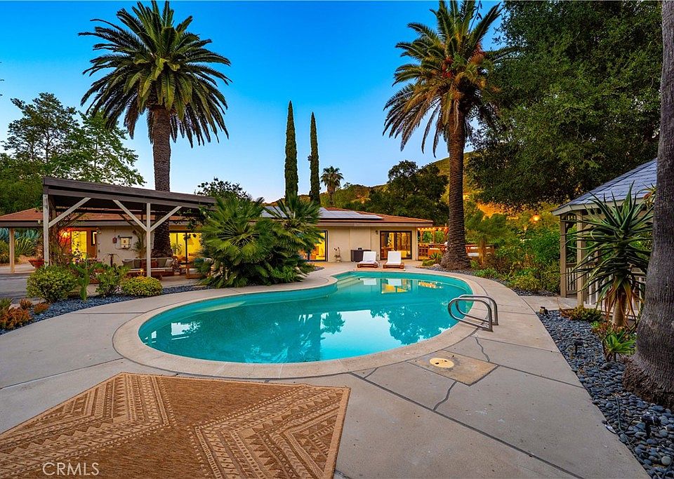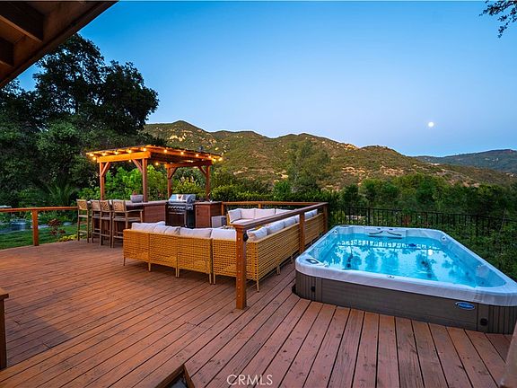 Discover a one of a kind creative sanctuary in the serene Calabasas Mountains offering a rare blend of privacy, versatility, and soulful living. This retreat features a beautifully updated four bedroom, three bath main residence complemented by a detached ADU perfect for guests, extended family, rental income, or a home studio. Inside, the open concept floor plan is filled with natural light and designed for seamless indoor outdoor living, creating an ideal environment for family gatherings, entertaining, or quiet relaxation. Step outside to enjoy a sparkling saltwater pool, cold plunge, and mineral rich swim spa, all surrounded by lush landscaping and mountain views. Over the past two years, the entire property has been thoughtfully transformed with thousands of plants into enchanting meditation gardens, meandering fruit tree paths, and a natural amphitheater designed for family events and community gatherings. Additional amenities include a detached ADU with a full kitchen and bath offering flexible space for guests or income potential, a dedicated yoga studio for personal practice or private sessions, an inspiring art studio ideal for painting, sculpture, or creative workshops, and a professional recording studio with a sound booth designed for musicians and creators. These carefully curated spaces provide opportunities for wellness, artistic expression, and connection, making this home perfect for families seeking a lifestyle that supports creativity and everyday living. Whether you envision hosting gatherings, running wellness retreats, or simply enjoying a peaceful lifestyle with proximity to Malibu beaches and Los Angeles, this property offers a rare opportunity to live, create, and thrive in a setting that feels like a private retreat while staying connected to city conveniences.