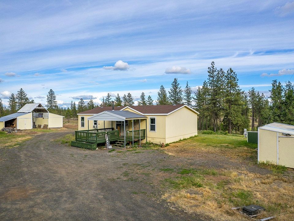 Updated 2005 Manufactured Home on 10 Acres. Enjoy plenty of trees & Territorial views! Open floor plan with Cozy living room complete with wood-burning stove. Light and bright kitchen with full appliance package, lots of cabinet and counter space, and pantry. Great room concept with cathedral ceilings. Large master suite with full private bathroom and walk-in closet. Both bathrooms remodeled. Energy efficient vinyl windows. Newer lighting. Covered front porch to relax on as well as back deck. Park-like setting with fruit trees, berry bushes, and 2 separate accesses into property. Property has seasonal pond, large barn/shop area and several other outbuildings.