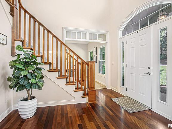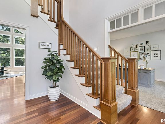 This beautiful five bedroom home on a private lot feels like a vacation getaway every day. Main floor features a circular floor plan with Brazilian cherry floors; formal living room and dining room; 2-story great room with gas fireplace, built-ins and expansive windows overlooking the wooded backyard; den/office with french doors; open kitchen with granite countertops, informal dining area and two butlers pantries; convenient second front entry into the mud room; powder room; and access to the screened porch. Upstairs is the primary bedroom with two walk in closets and a large, light filled bathroom; three additional bedrooms; hall bath; and alcove. The finished walk out basement includes a wet bar; rec rooms; fifth bedroom; full bath; and abundance of storage space. Additional features include an inviting covered front porch; a deck off the screened porch leading to a professionally hardscaped fire pit area; and a 3-car garage. Roof 2017.