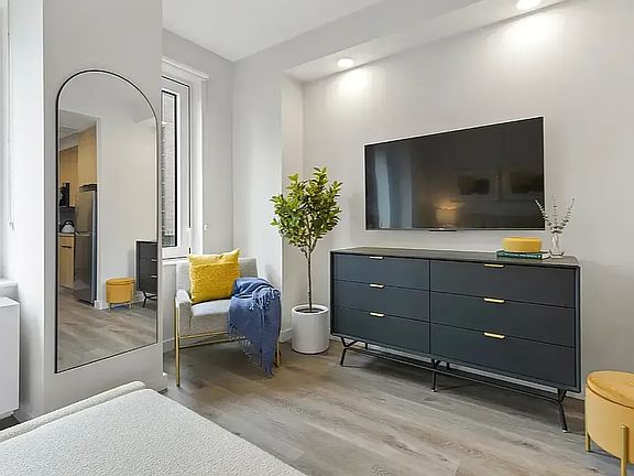 The efficient, open floor plan with select finishes exemplifies contemporary functionality and style. Natural light pours through oversized windows, highlighting warm wood tones and chic stone surfaces. The single-line kitchen is equipped with custom wood-paneled cabinets, beautiful quartz countertops, a tiled backsplash, and full suite of modern appliances including a dishwasher and eco-friendly electric cooktop. The bathroom boasts a soothing color palette and is adorned with matte black fixtures and a chic vanity mirror with integrated LED lighting. The home also has several built-in closets for convenient storage and an in-unit washer and dryer.