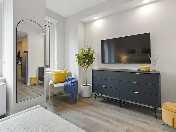 The efficient, open floor plan with select finishes exemplifies contemporary functionality and style. Natural light pours through oversized windows, highlighting warm wood tones and chic stone surfaces. The single-line kitchen is equipped with custom wood-paneled cabinets, beautiful quartz countertops, a tiled backsplash, and full suite of modern appliances including a dishwasher and eco-friendly electric cooktop. The bathroom boasts a soothing color palette and is adorned with matte black fixtures and a chic vanity mirror with integrated LED lighting. The home also has several built-in closets for convenient storage and an in-unit washer and dryer.