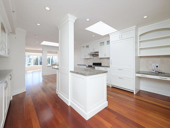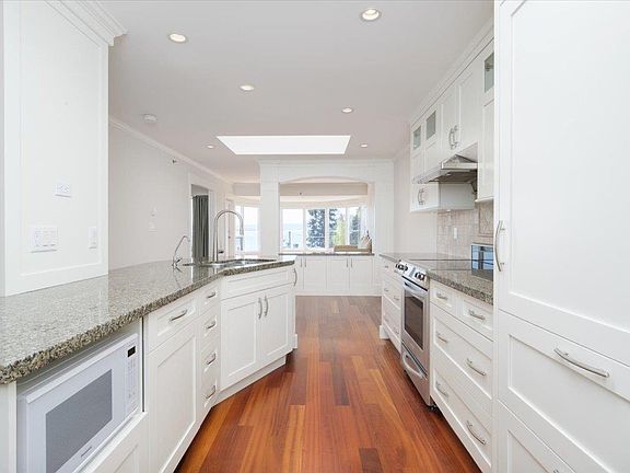 Welcome to a sophisticated seaside retreat just steps from the Seawall & the heart of Dundarave Village. This beautifully renovated 2-bedroom, 2-bath residence offers the perfect blend of refined living & West Coast ambience, framed by breathtaking ocean views & glowing sunsets. Soaring skylights & walls of south-facing windows fill the open-concept layout with natural light, while Brazilian cherry hardwood floors & crown moldings add warmth & style. The generous, sunlit kitchen is a chef’s delight—featuring granite counters, custom cabinetry, & premium appliances including a Sub-Zero fridge & Bosch dishwasher. The spacious primary suite includes his-&-hers closets and a luxurious ensuite with heated marble floors. Your own partially covered terrace, an idyllic spot for morning coffee.