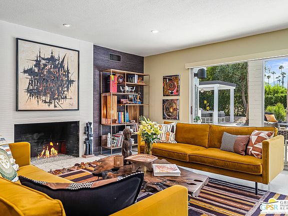 Recently featured in Palm Springs Life Magazine and The New York Times, and chosen for the 2025 Modernism Week Signature Home Tour, this mid-century modern gem is situated in South Palm Springs' highly sought-after Indian Canyons neighborhood. Built in 1963 as a model home and thoughtfully expanded, it now spans nearly 4,000 square feet on a spacious 1/3-acre lot bordering the Indian Canyons Golf Course. Over the last four years, it has been updated to highlight sweeping mountain views and seamless indoor-outdoor living. Interiors feature a dramatic entry, open living area, built-in bar, and a wall of sliding glass doors to the backyard. The reimagined chef's kitchen includes custom cabinetry, designer tile, and premium Dacor and Miele appliances. Recent upgrades include three HVAC systems, dual-pane windows, an updated electrical panel, automatic window shades, plus vibrant paint and wallpaper. Outdoor enhancements include two fire pits, a pergola dining area, a built-in BBQ, an outdoor shower, a freshly re-plastered pool, a new foam-coated roof, and lush landscaping. With room for a casita or extra garage, and golf cart parking, this home blends classic design with modern ease.