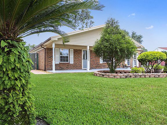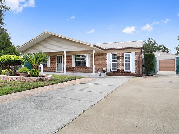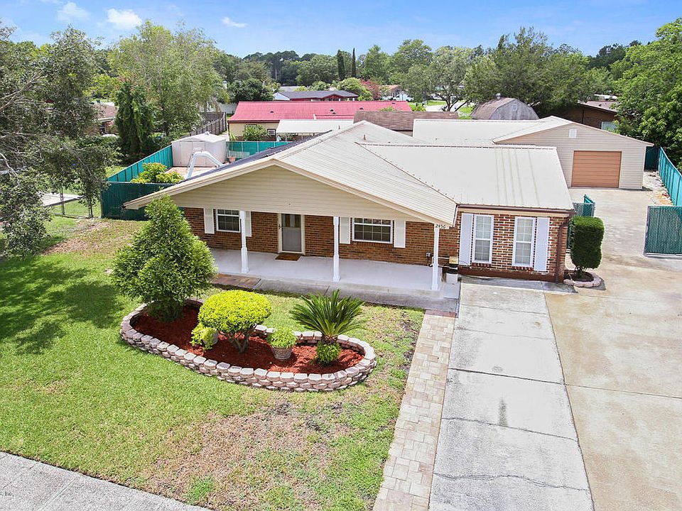 Lovely brick home is well cared for with many custom features including cherry wood cabinets and quartz countertops in kitchen with custom built-in storage. Bamboo and tile floors throughout. Detached oversized 1 car garage with plenty of storage and extra long driveway for added parking. 2 yr old screenroom overlooking private backyard with pool and hot tub. Separate 15x11 rm with tile floor and wall unit AC perfect for office,studio space or 3rd bedroom. Home located in quiet neighborhood on dead end street with convenient access to major interstates, shopping and beaches.
