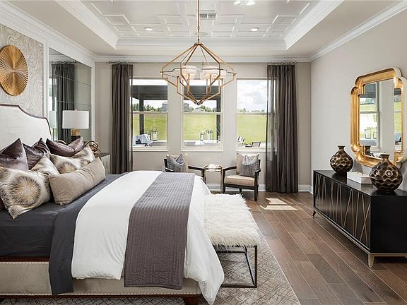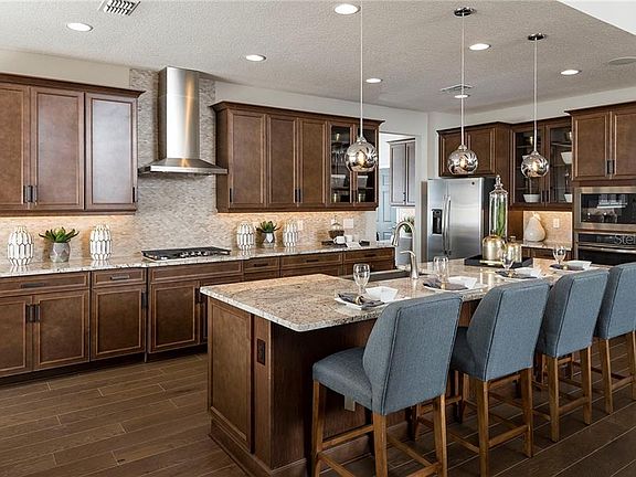 This Brookhaven model home, with 4 bedrooms, 4 baths, a bonus room, and a balcony, is nothing short of spectacular! The designers thought of everything in this home from ceiling to floor. From the extensive use of wood flooring in the common areas, to the gorgeous custom wood beams in the family room and custom wood ceilings in the master, dining room and foyer, this home exudes warmth. Upon every turn you won't know what to focus on first: from the living room built-in with 2 wine fridges and wine barrels in the wall to the beautiful custom made wall units in the bonus room and living room, or the magnificent lighting fixtures throughout and custom made summer kitchen on the lanai of home. The stunning kitchen showcases warm-tone maple cabinetry with accents of glass doors and crown molding, a stainless steel exhaust hood over the gas cooktop, as well as a built-in microwave and wall oven, granite counters with a farmhouse sink, and stone backsplash. A dreamy owner's suite with spa-like bath with polished marble-look tile on the floor and accent tile in the shower. The show-stopper here is the free-standing tub centered perfectly under the windows. The views from the lanai and balcony are not to be missed! All that, and it's built to save you the cost of home ownership by being built to Energy Star 3.1 standards and is third-party rated for energy efficiency and is backed by M/I Homes 15-Year Transferrable Structural Warranty. This one is a must see -come make this home you