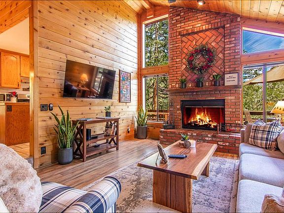 Discover your perfect mountain retreat in the heart of Idyllwild! This adorable cabin is filled with character and charm, offering the ideal blend of rustic comfort and modern upgrades. Relax and take in the incredible views from your brand-new-deck, perfect for morning coffee, or evening sunsets, or entertaining under the stars. Inside, you will be greeted by a large living area with floor to ceiling wood burning brick fireplace, high vaulted souring ceiling, bright and light with several windows for the absolute amazing views. This cozy cabin features 2 bedrooms and a full sized bathroom with newer vanity, a cute and cozy kitchen area, a separate dining area with all new lighting. Recently remodeled with a new outdoor deck, stairs and fencing, surrounded by twinkling lights. Newer water heater, AC was added in 2020 for year round comfort, many upgrades have been done by the sellers. Located just minutes to downtown Idyllwild for quaint boutiques and restaurants. There is also a downstairs basement under the cabin that can be converted to another living space. SOLD TURNKEY FURNISHED. Come see this COZY CABIN today. Sellers want this cabin SOLD!