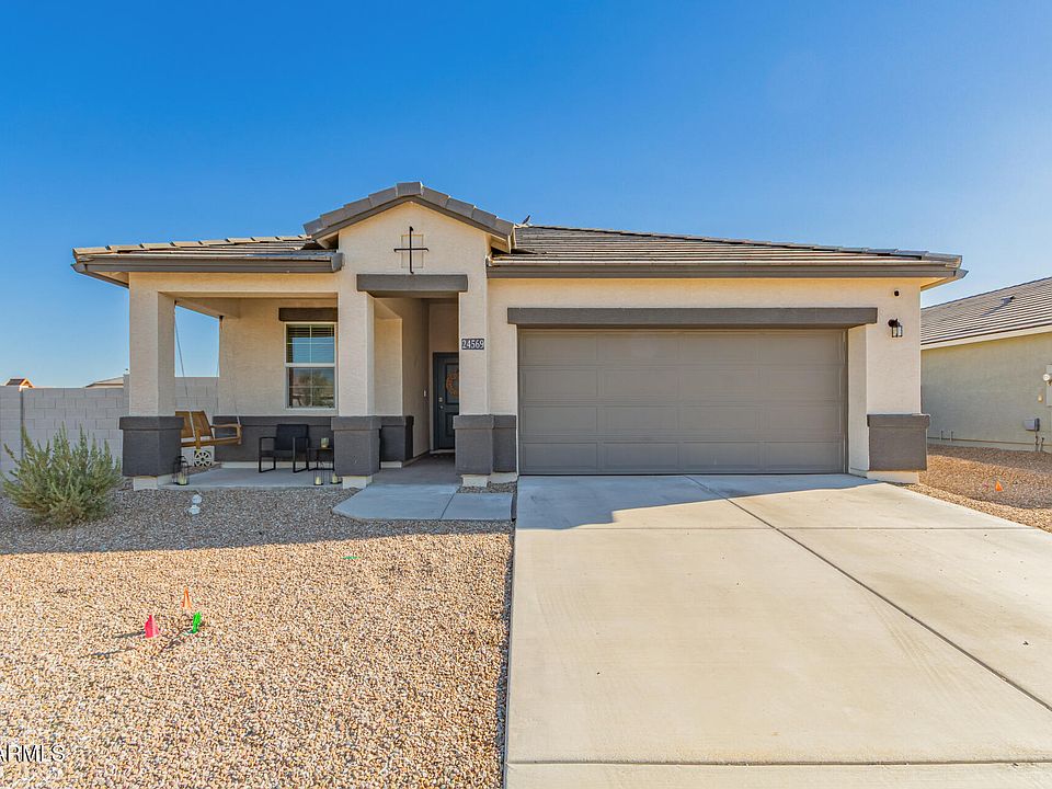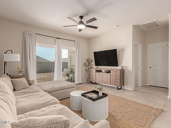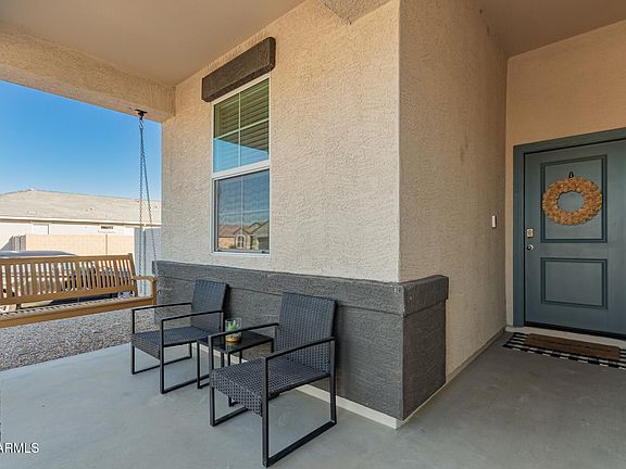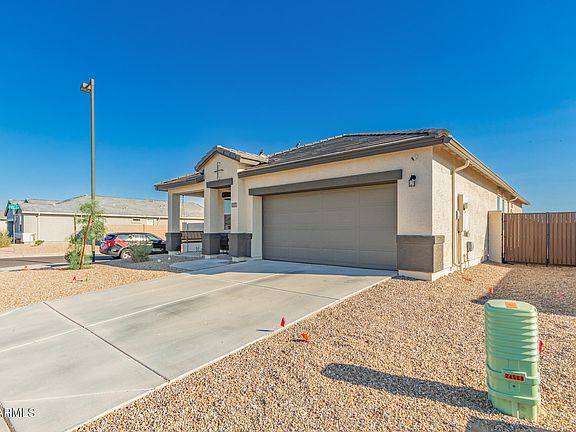 Welcome to this model-like 3-bed, 2.5-bath home in Estrella Vista! Sitting on a corner lot, it features a 2-car garage, RV gate, front porch, and low-maintenance landscaping. Inside, you'll love the open layout with abundant natural light, neutral tones, and tile in the main areas, complemented by plush carpeting in the bedrooms. The kitchen offers stainless steel appliances, granite counters, a walk-in pantry, and an island with a breakfast bar. A versatile den adds extra living space. The primary suite boasts dual sinks and a walk-in closet. Out back, enjoy the covered patio and fenced turf area, which is perfect for gatherings, pets, or play! All just minutes from Sundance Park and the White Tank Mountains with stunning sunsets and scenic hiking trails!
