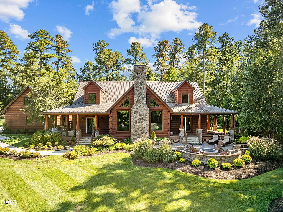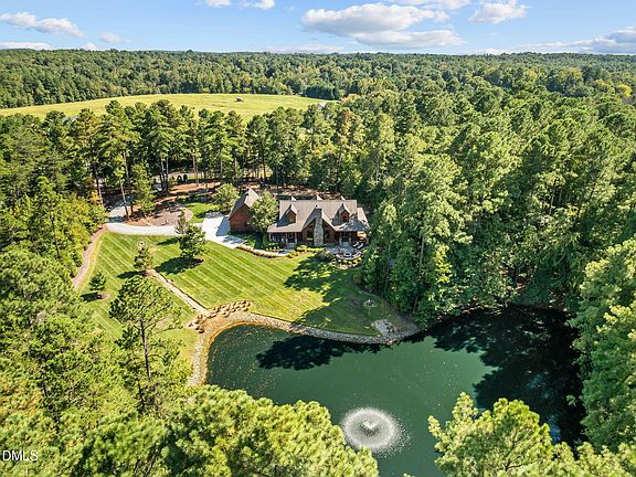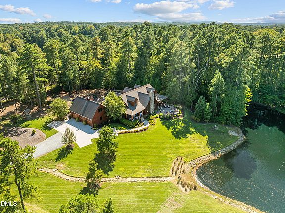 Imagine your perfect zen lifestyle. Truly a unique indoor-outdoor living experience. Built in 2014, this log home has all the must-have modern amenities and more. Private, gated retreat on nearly 8 acres. Enticing views of the stocked pond -- a calming experience watching the blue herons and bubbling fountain. The vaulted great room features a central tree column harvested from the property, plus custom fireplace mantle logs from New Bern with a history lodged inside--a civil war bullet! Primary suite on the main level has gas log fireplace, walk-in closet, spa bath with whirlpool, views of the pond, and direct access to the deck plus hot tub/spa. First floor living is maximized with another bedroom and full bath on the main. Two additional bedrooms, full bath and loft sitting area complete the second level. Home automation to the max with finger tip controls for cameras, locks, indoor/outdoor lighting, shades & irrigation. Enjoy quiet mornings and evening on the wrap-around deck crafted from cypress trees imported from Mississippi, copper fittings & custom stone accents. The pond-side patio features a built-in fire pit. Additional outdoor features include the screened gazebo, fenced backyard, and detached office/guest/artist retreat. The three-bay garage with a built-in EV charger, is a dream for private car collections. Enjoy the unfinished space above for storage or custom finishing. Peace of mind amenities include the whole-house generator, surge protection, and an 100amp circuit in garage. Convenient access to UNC/Chapel Hill, Duke/downtown Durham and Greensboro-- all 25-30 minutes travel time.