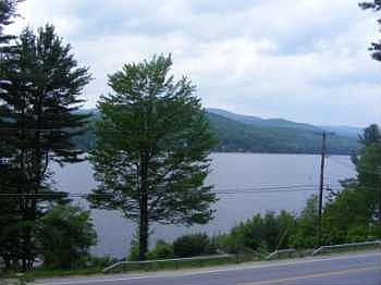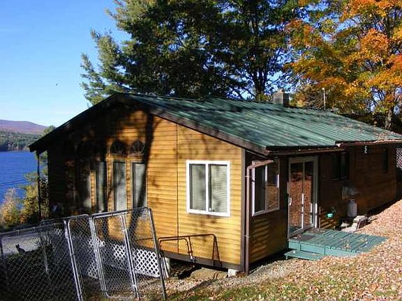 "REDUCED! Day: Lakefront Adirondack Cedar ranch with lake & mtn views in turn key condition-Lots of wood & charm! Great rm w/ cathedral ceiling, lots of pine and windows& pellet stove, liv rm w frplc w wdstv insert & cherry mantel, eat in kit, 2 bdrms, mud rm, 1 bath, front and side decks. Front and back access to house allowing extra parking. Lake permit of 46 1/2' with dock and mooring buoy.$214,900.