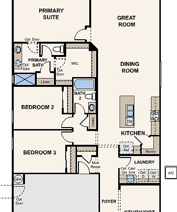 Ranch | 2 Bay Garage with Entry | Mud Room | Foyer | Laundry Room | Open Kitchen with Island and Pantry | Dining Room | Great Room with Yard Access | Primary Suite with Bath and Large Walk-In Closet | Secondary Bedrooms with Shared Full Bath | Covered Patio Options: Bedroom 4 in lieu of Study, Primary Bath Tub and Shower, Primary Bath Super Shower, 3 Bay Garage, Extended Covered Patio Impressive Included Features: 9' ceilings throughout, covered patio, front yard landscaping, ceramic tile flooring at entry, kitchen, all baths and laundry, granite slab counters in kitchen and baths, stainless steel kitchen appliances, Century Home Connect smart home technology.