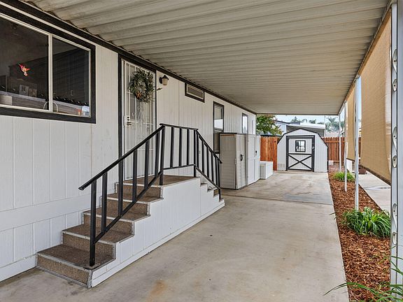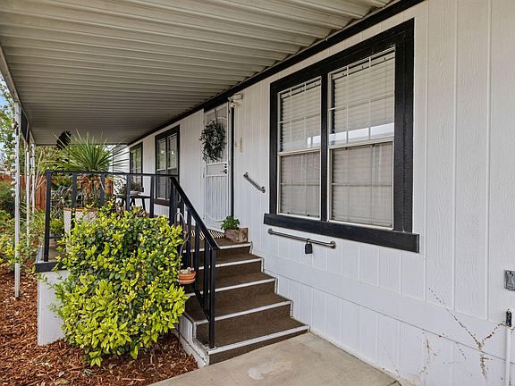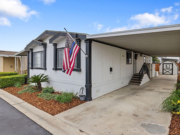 Oaks Estate Mobile Home Park is a Beautiful Gated Community for Seniors 55 and over! This spacious 2 bedroom, 2 bath mobile home is Turn Key and ready for a new home owner! Beautifully maintained with pride of ownership! Looks like a model home! Painted blue cabinets with leaded glass gives this home character and charm. Open floor plan makes for a cozy and comfortable living space with an additional bonus room! Outside is a nice shed for storage and the backyard is perfect for small pets and gardening! Master bath has a doggie door to let your furry pet come and go into the backyard with a personal stairway to the backyard! Relax on your covered patio and feel safe in this highly sought after community! The gated community features a club house, gym, common pool, and RV parking available.